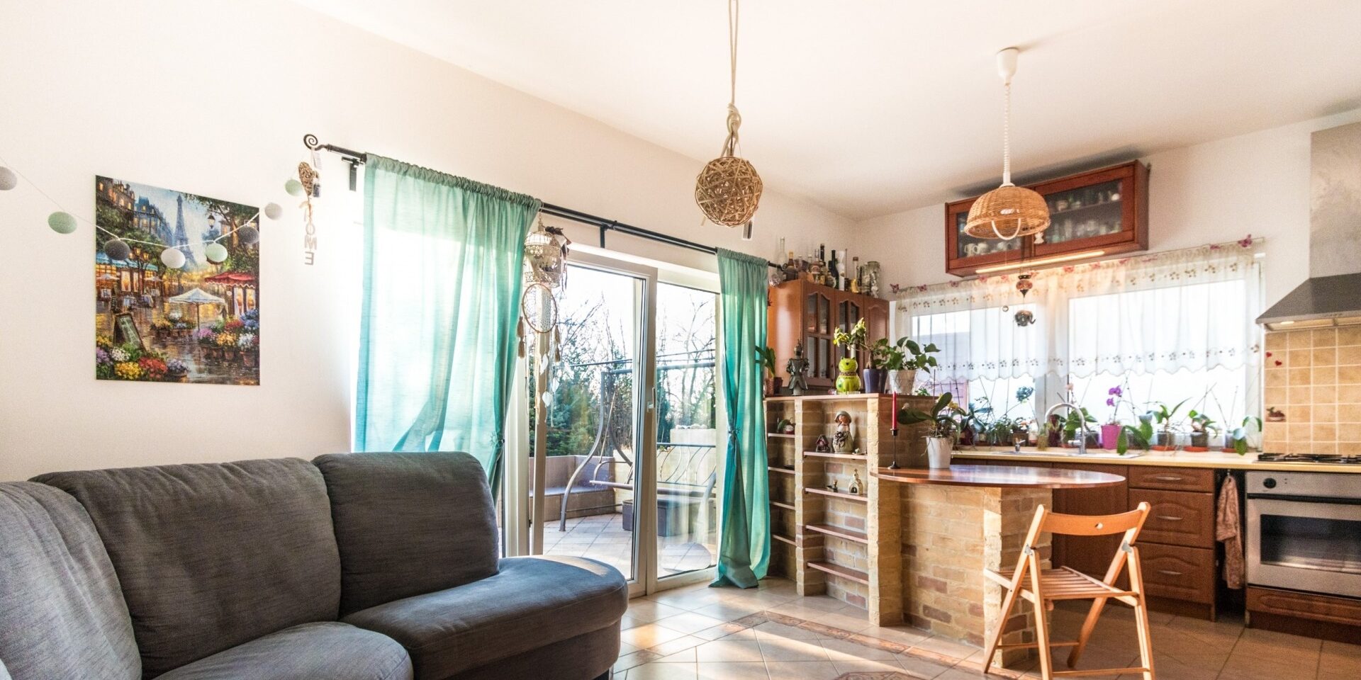 A lakás földszintjén tágas amerikai konyhás nappali + 1db 7,5 nm-es vendég/dolgozó szoba, ezen felül egy kádas fürdőszoba Wc-vel. Nappaliból nyiló teraszon egy beépített medence található.