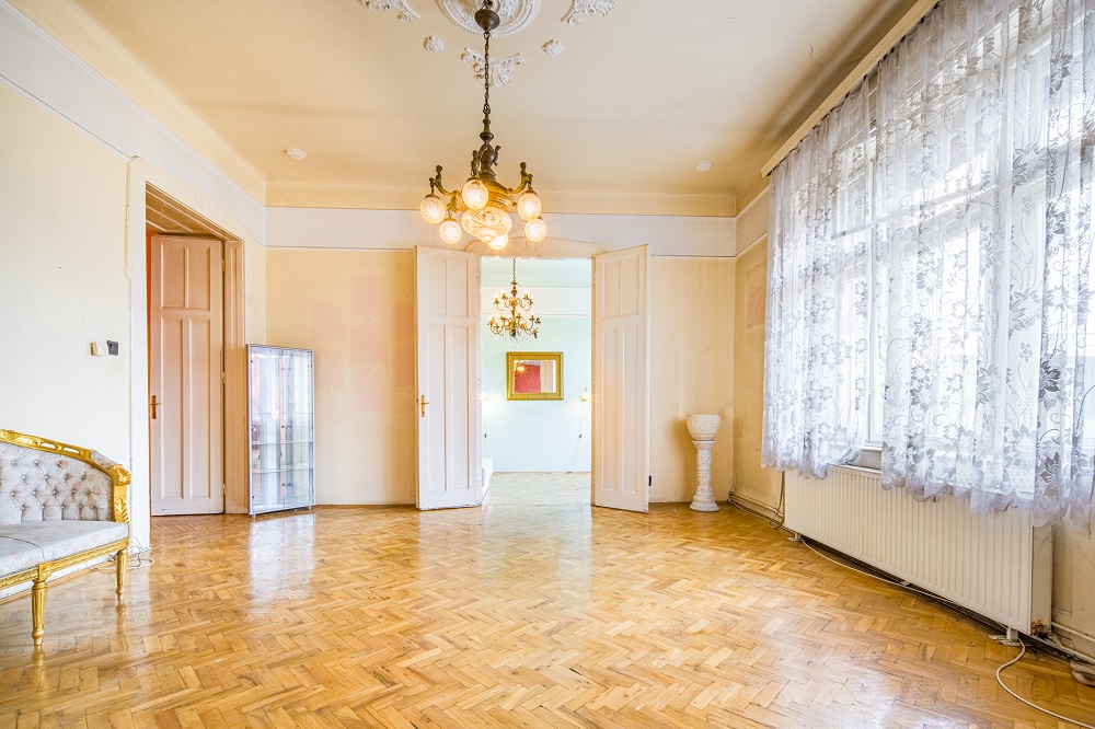 Józsefvárosban, a Teleki téren piac felé, utcafrontra néző, első emeleti, 3 szobás, felújítandó, a tulajdoni lapon 93, a valóságban nettó 97 m2-es lakás külső homlokzatilag felújított, liftes társasházban.